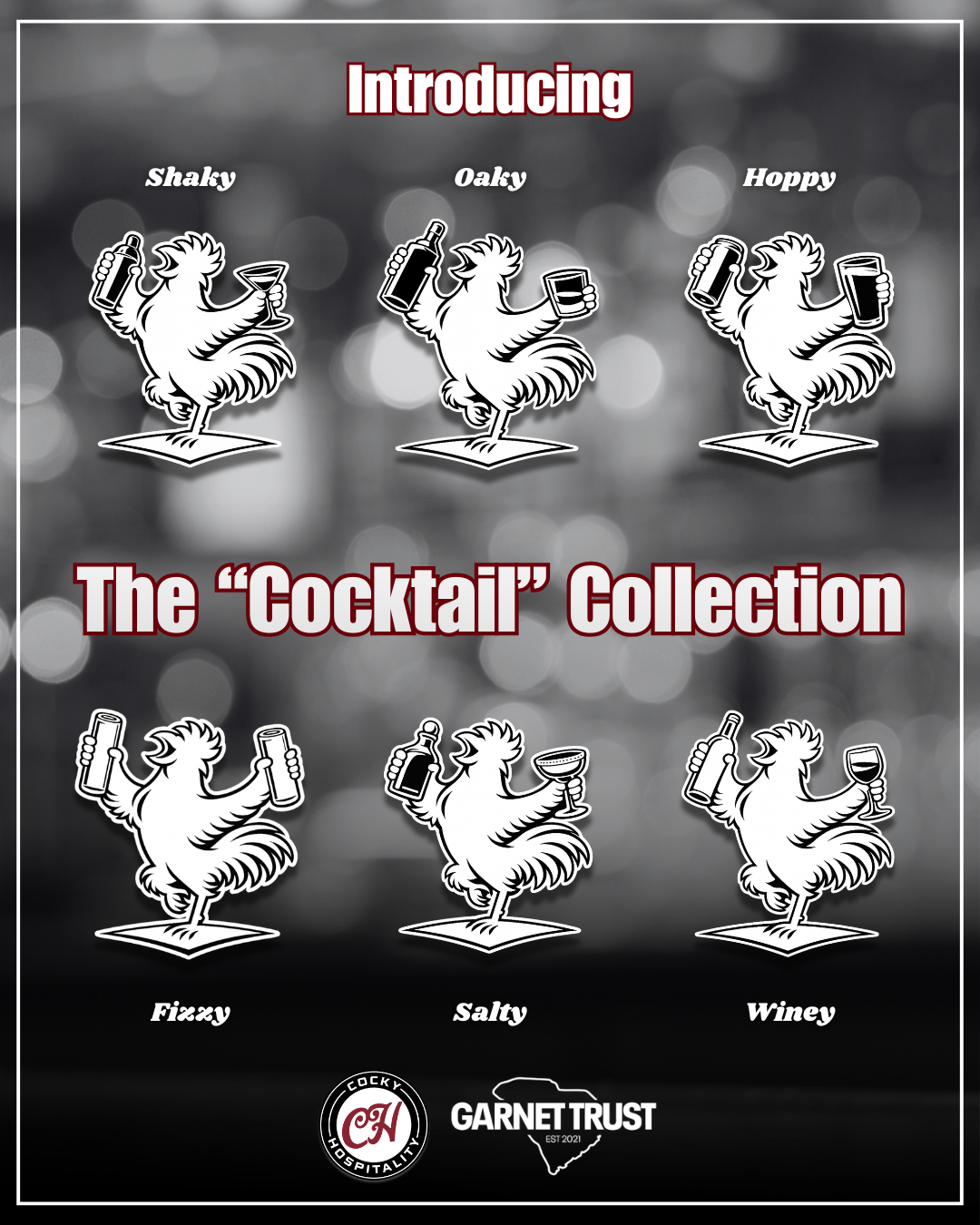 Shaky, Oaky, Hoppy, Fizzy, Salty, and Winey — a beverage-inspired hat collection offering a toast to Gamecock pride, community, student-athletes, and your drink of choice.